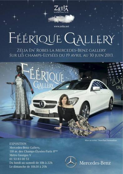 Le showroom emblématique de Mercedes-Benz à Paris s’habille donc en bleu et le blanc, en gardant ses murs noirs caractéristiques. Pour cela, Zélia a demandé à Jean-Paul Sermadiras de prendre en charge la mise en scène de l’exposition. Cet homme de théâtre a crée une véritable installation inspirée des contes et légendes et de traiter les robes et les automobiles comme des œuvres à part entière. Dans, ou sur chaque voiture, un mannequin articulé met en scène une création de l’artiste. Deux robes seront également exposées à l'entrée de cette « Féérique Gallery », et une troisième dans le showroom. Dans ce dernier, trois « mini expositions » donnent le ton sur l'univers de Zelia, à travers des photos et des objets chers à cette créatrice autodidacte originaire de Picardie.