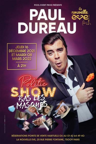 Avec POLITIC SHOW -BAS LES MASQUES, Paul Dureau présente un spectacle hilarant pour les petits comme les grands, fait d'analyses humoristiques de l'actualité, de sketchs, chansons et imitations... Entre les Macronneries de Castex, les Zemmourades de Le Pen et les Hidaldingueries de Mélenchon, le rire devient comme le passe sanitaire: OBLIGATOIRE!