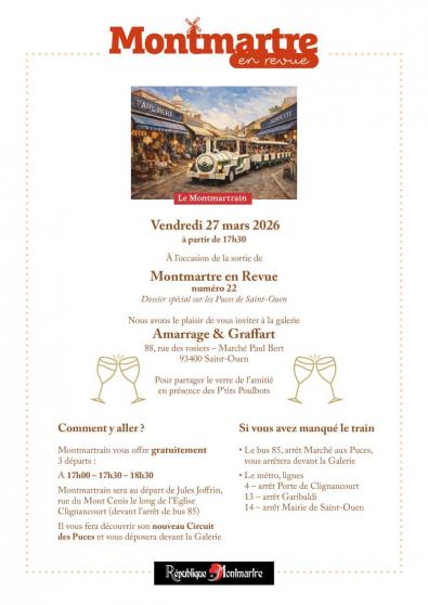 Montmartre en Revue fêtera sa sortie aux Puces de Saint Ouen. A 17h,17h 30, 18h 30 un Montmartrain partira de la rue du Mont Cenis ,à côté de l'église Clignancourt, et vous y conduira gratuitement . A cette occasion , vous découvrirez le nouveau Circuit des Puces....préfigurant le prochain grand circuit depuis Montmartre aux Puces.